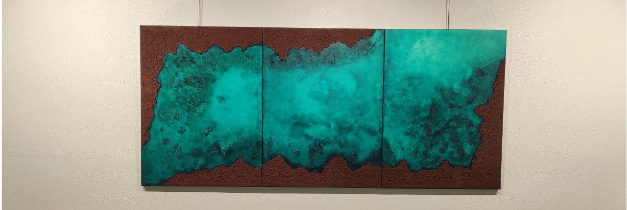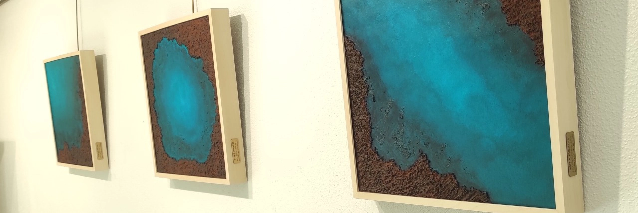 Cuadros texturizados de paisajes marinos y costeros, de la colección Ecos de Óxido y Esmeralda.